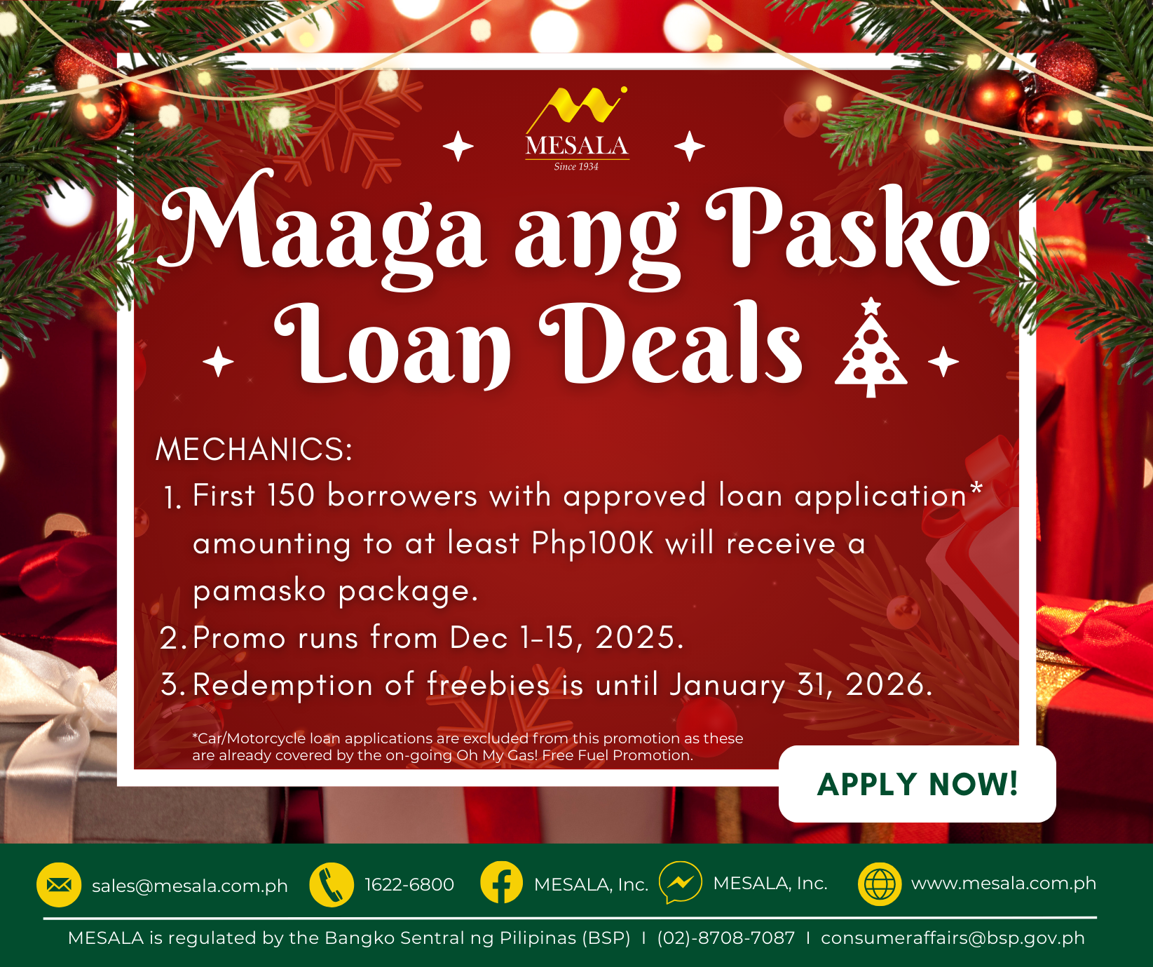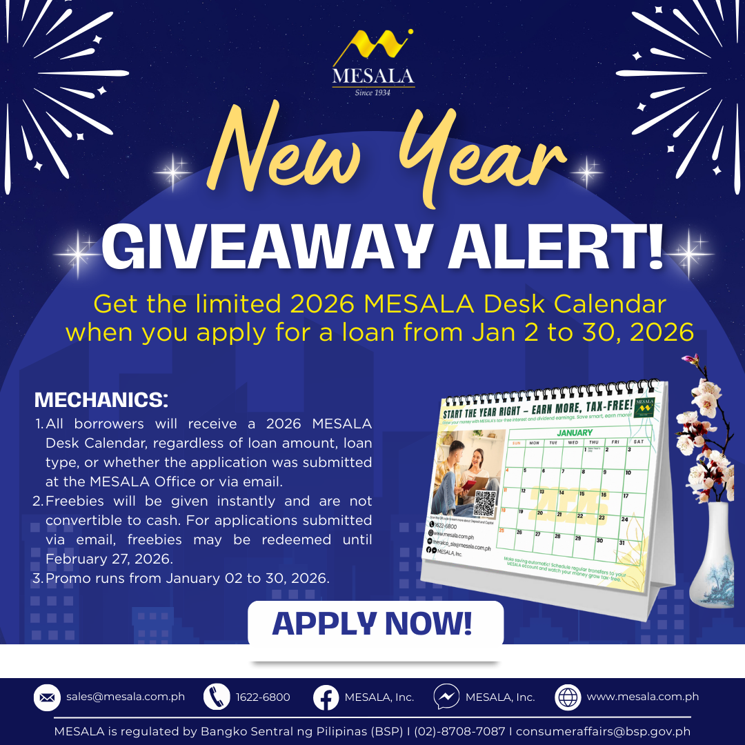 ...For loan inquiries, call 1622-6800 or email sales@mesala.com.ph